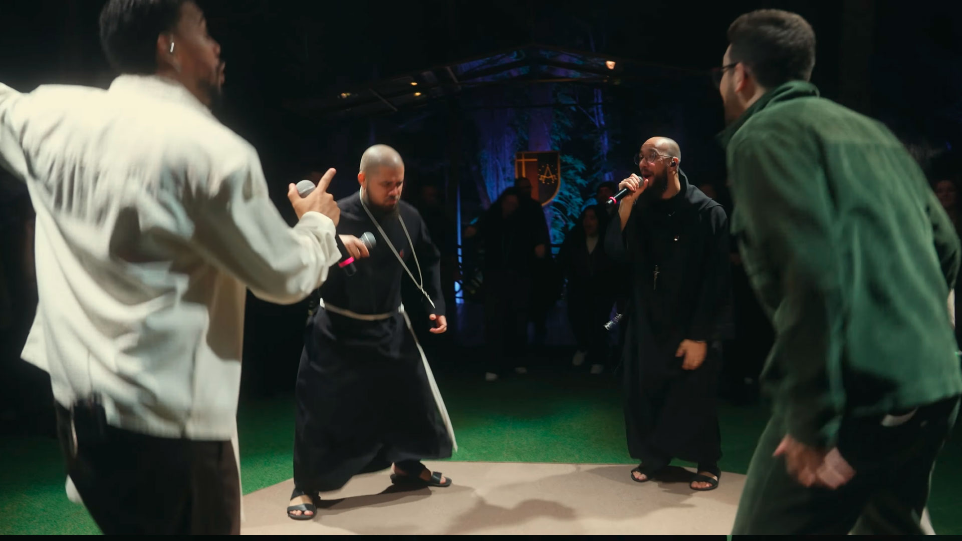 A Fraternidade São João Paulo II utiliza uma linguagem contemporânea para evangelizar, como no trecho “E pregando o Evangelho em flow” [02:46], deixando claro que a fé é viva, atual e capaz de transformar vidas, dando um basta definitivo ao passado: “O homem velho já descansa em paz e os laços da morte que me prendiam hoje já não prendem mais” [03:04].